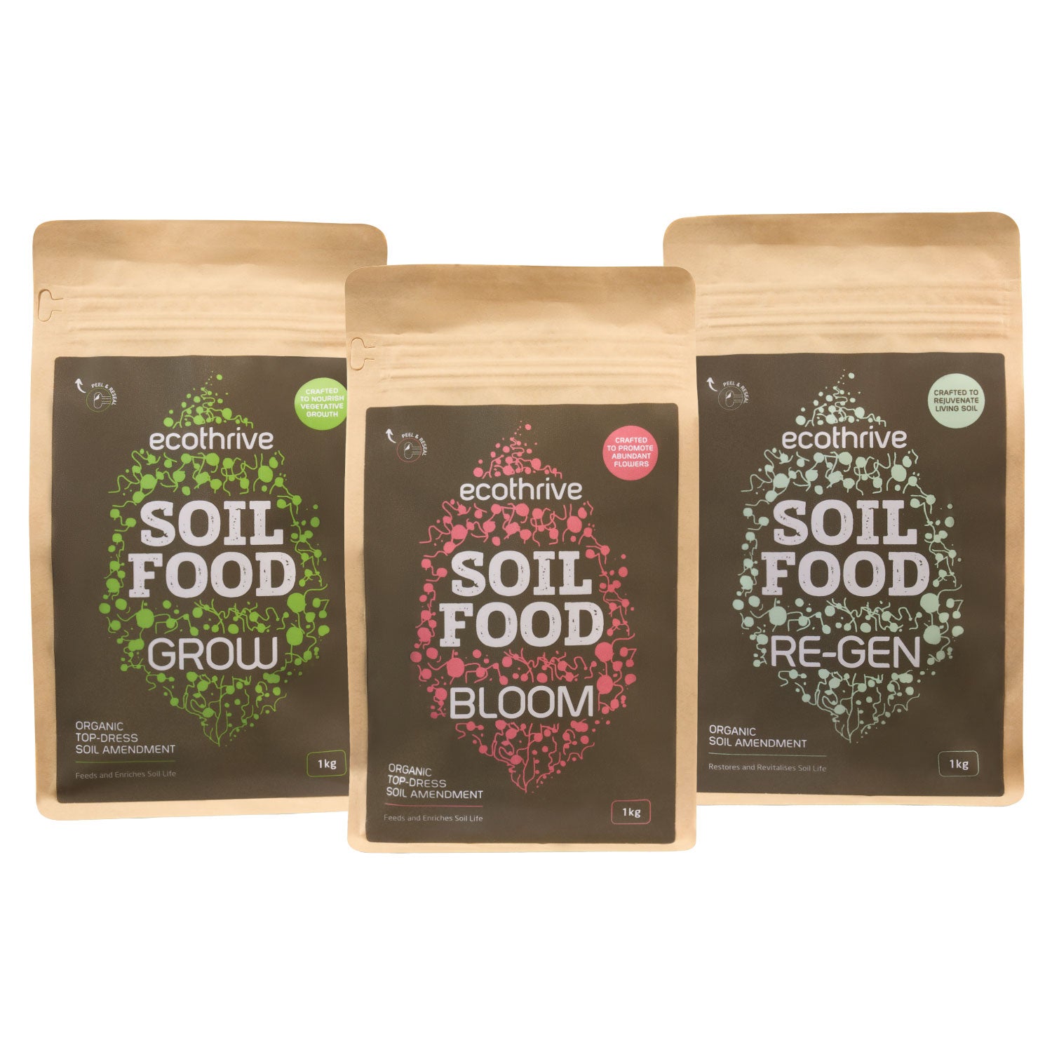 Heavy-feeding plants grown under high-intensity grow lights will eventually use up what's in the soil. That's why we created the Soil Food range to work alongside our Living Soil and keep nutrition balanced throughout the cycle. Soil Food is made up of three products—dry, organic top-dressings created to replenish what your plants use at each stage: