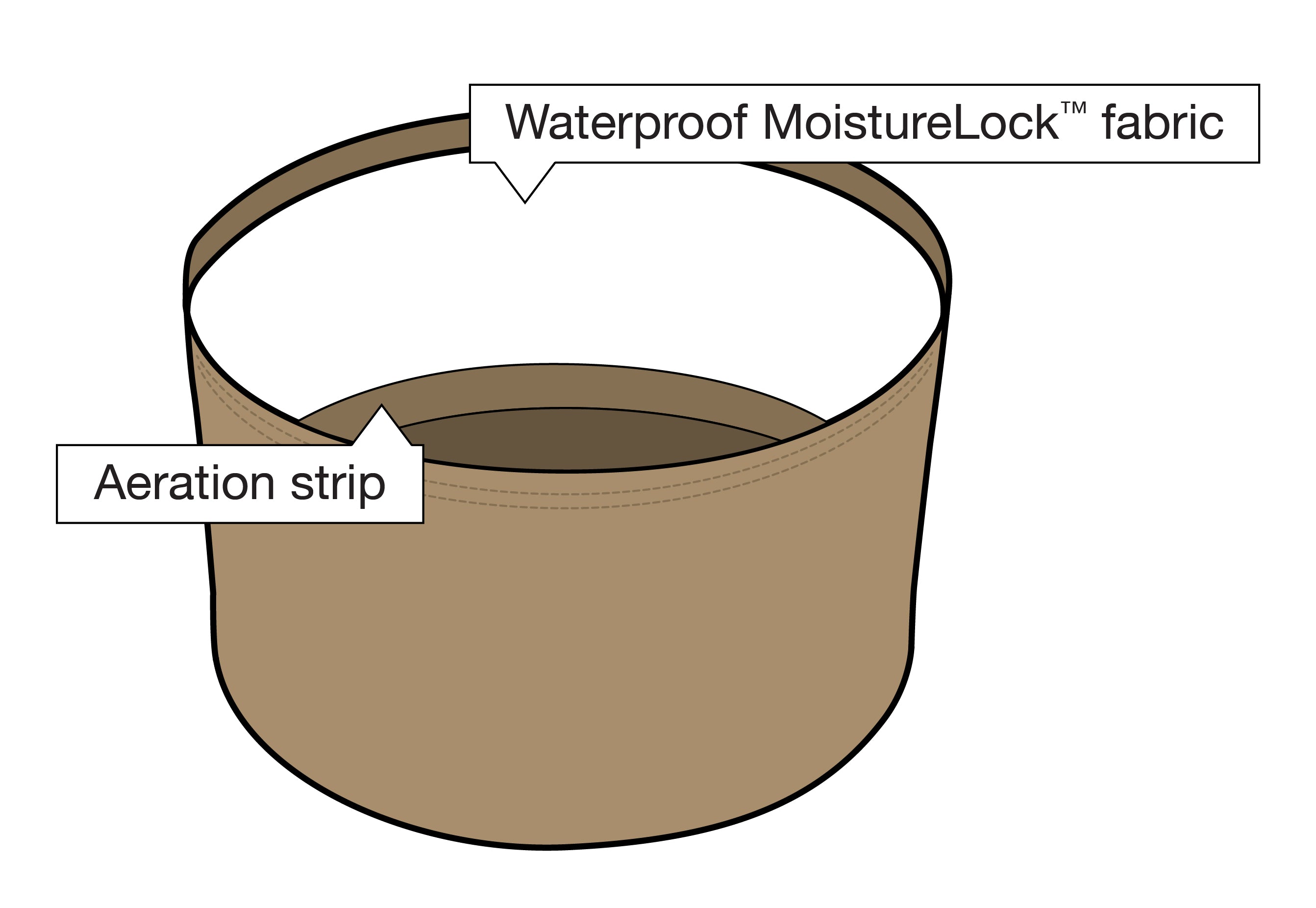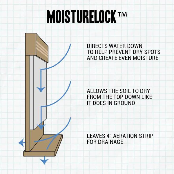 MoistureLock is a strip of BPA-free waterproof fabric sewn inside the container. It directs water downward, preventing dry pockets and promoting even moisture. This helps soil microbial communities thrive by simulating natural soil drying patterns.