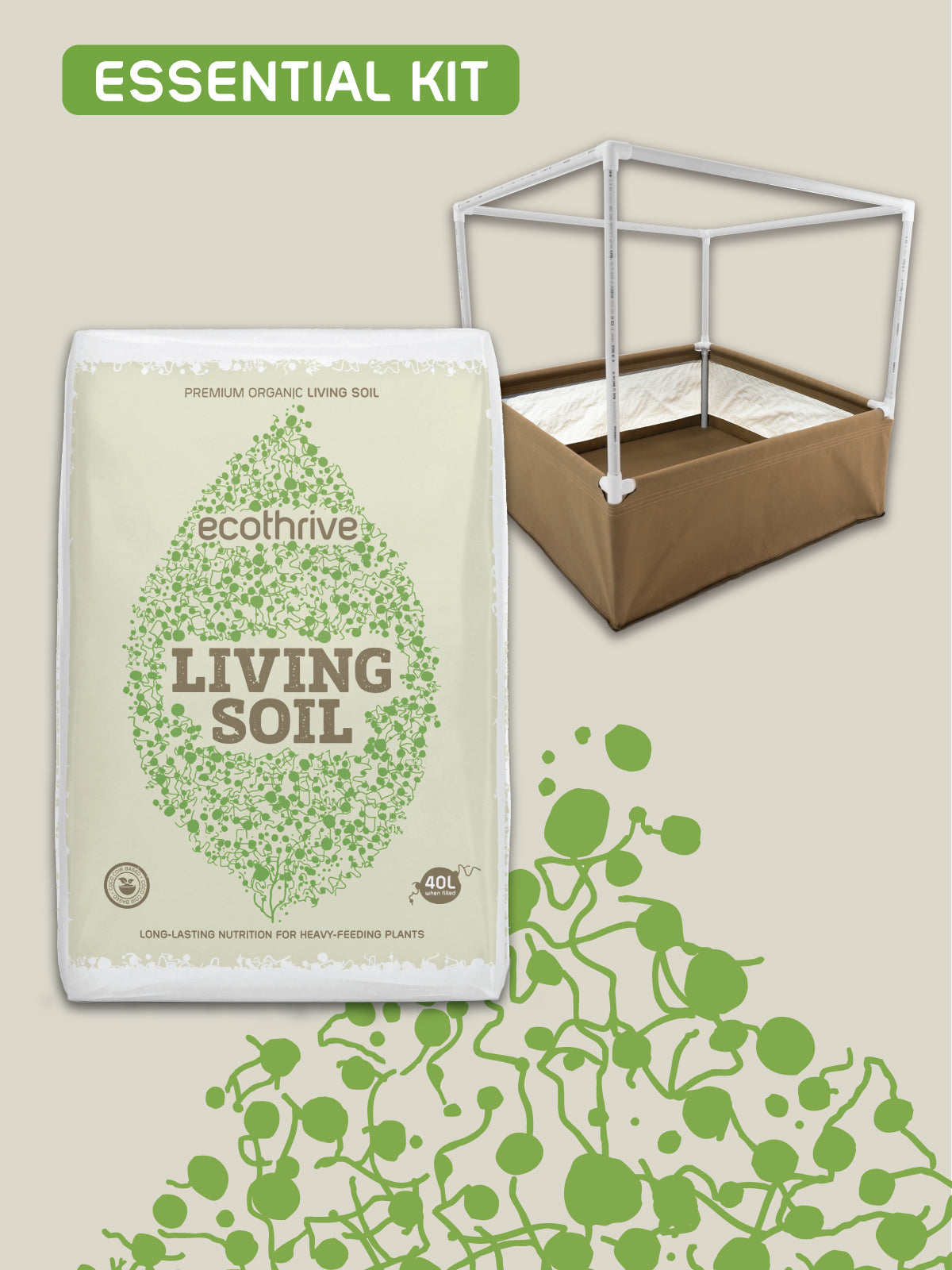 We’ve kept things super simple for our Essential Living Soil Bed Kits. Just select your preferred bed size (2 x 4ft, 3 x 3ft, 3 x 6ft, 4 x 4ft or 4 x 8ft) and you’ll receive your Grassroots fabric bed along with just the right quantity of our pre-blended, ready-to-use Ecothrive Living soil.