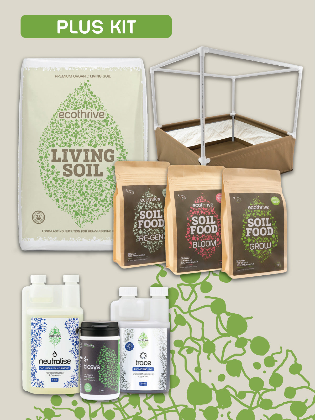 With our Plus Living Soil Bed Kits you choose your preferred bed size (2 x 4ft, 3 x 3ft, 3 x 6ft, 4 x 4ft or 4 x 8ft) and you’ll receive your Grassroots fabric bed along with the perfect quantity of Ecothrive Living Soil, just like in the Essential kit—but we also include three carefully selected Ecothrive Amendments: Soil Food, Trace, Biosys and Neutralise.
