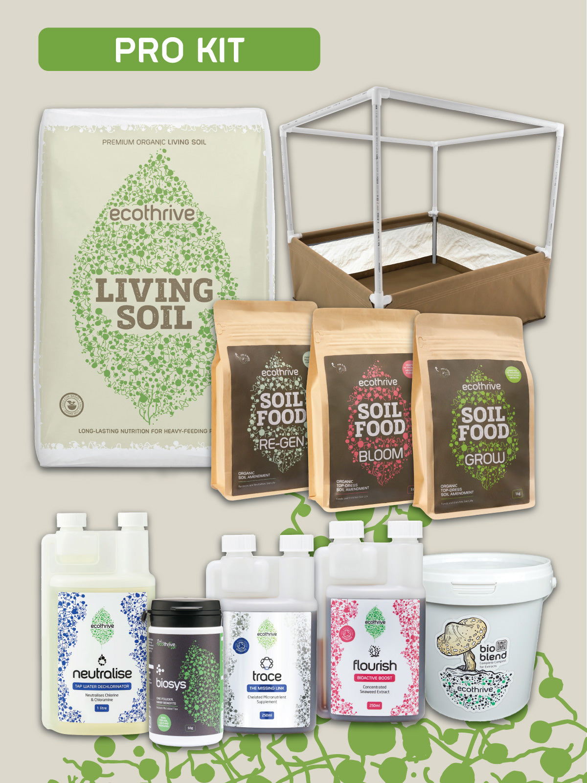 Designed for serious growers who want to give their plants the very best! You will receive your preferred bed size (2 x 4ft, 3 x 3ft, 3 x 6ft, 4 x 4ft or 4 x 8ft) along with just the right quantity of Ecothrive Living Soil plus Soil Food, Trace, Biosys and Neutralise, Flourish and Bio Blend.