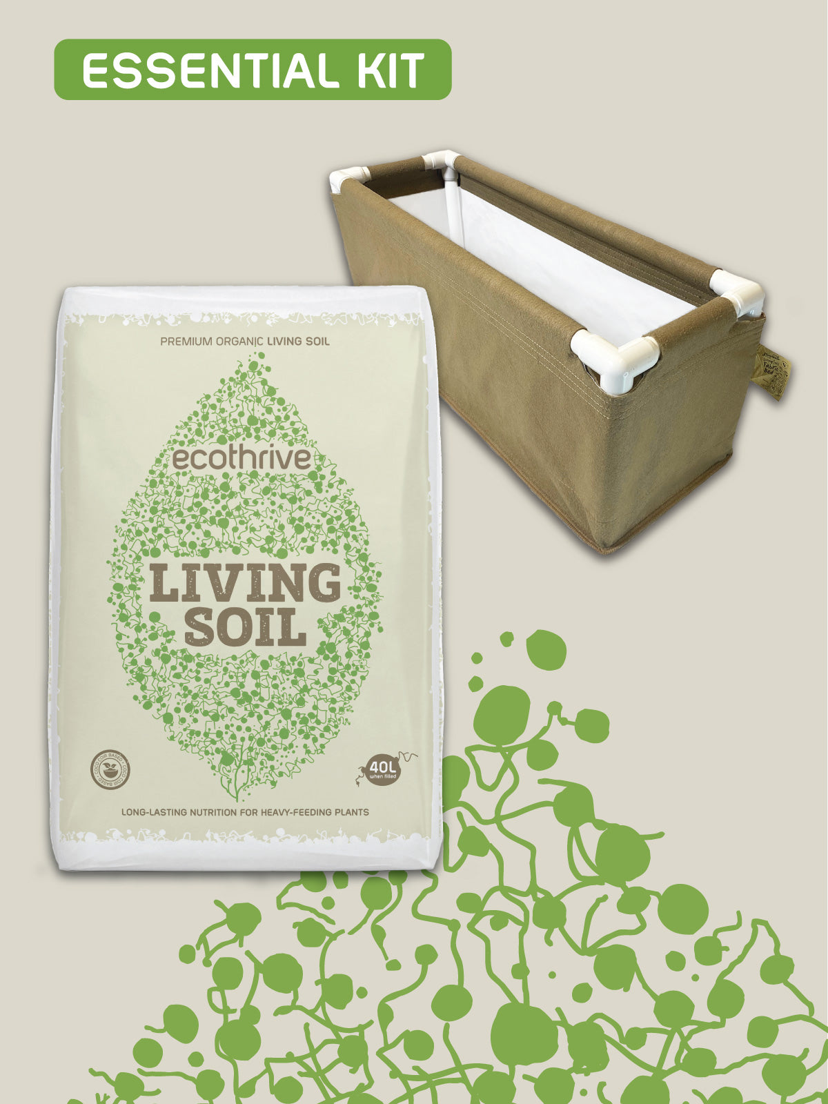 We’ve kept things super simple for our Essential Living Soil Bed Kits. Just select your preferred bed size (2 x 4ft, 3 x 3ft, 3 x 6ft, 4 x 4ft or 4 x 8ft) and you’ll receive your Grassroots fabric bed along with just the right quantity of our pre-blended, ready-to-use Ecothrive Living soil.