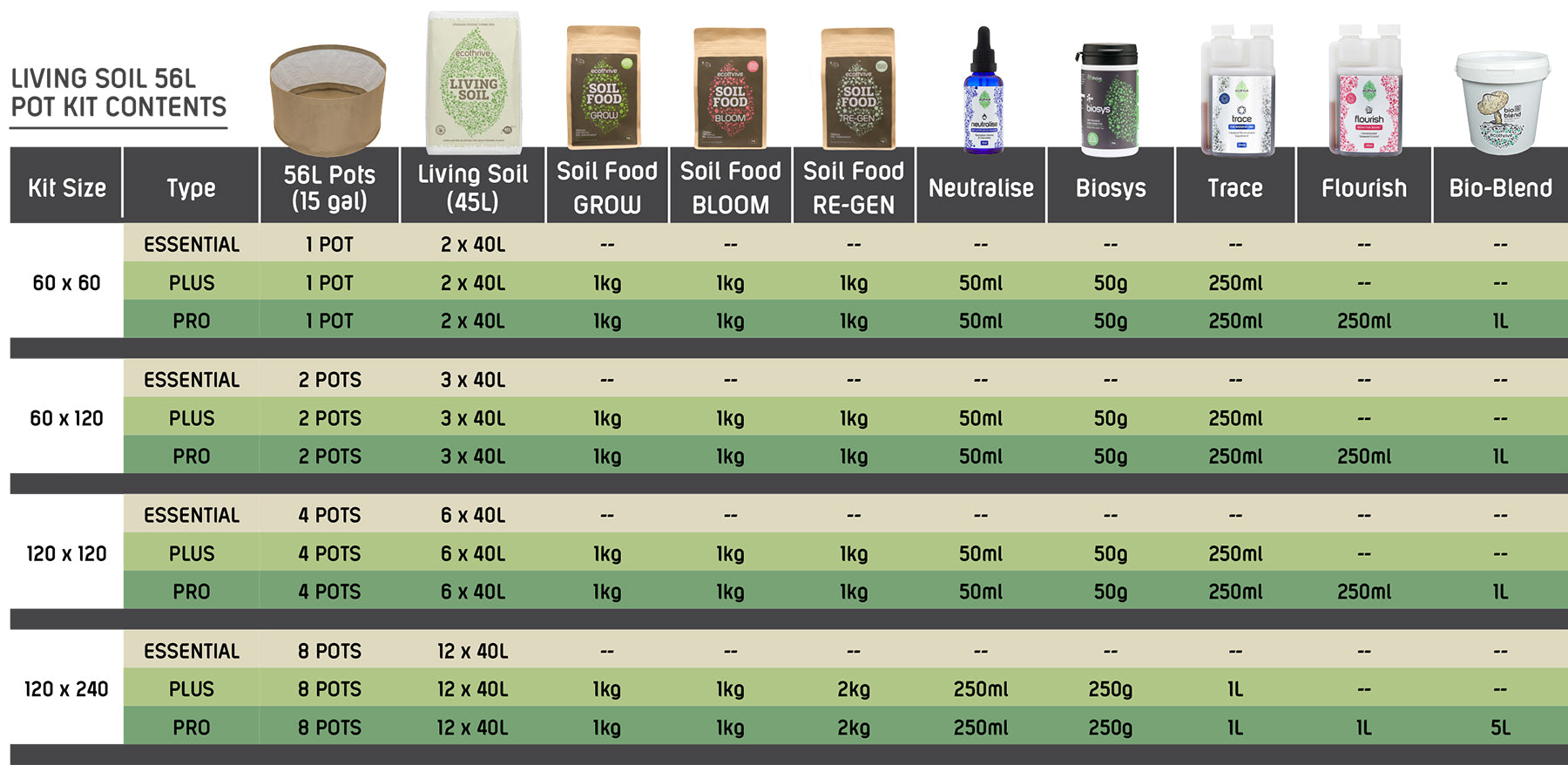 You’ll also receive the volume of Ecothrive Living Soil you need to fill them perfectly with our pre-blended, ready-to-use living soil.