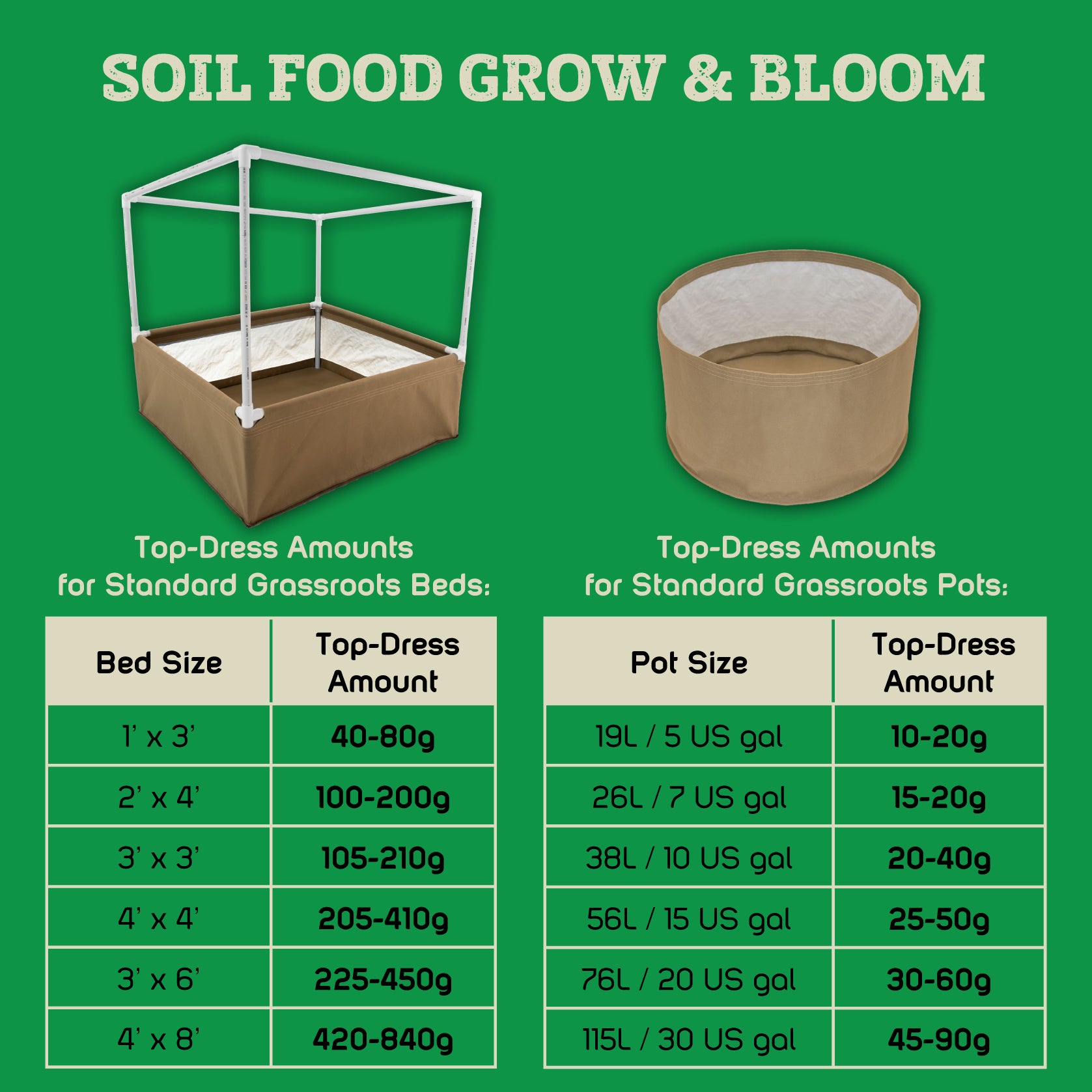 - Soil Food Grow: Use during vegetative growth (3-4 weeks after planting in small pots or 4-6 weeks in larger pots).