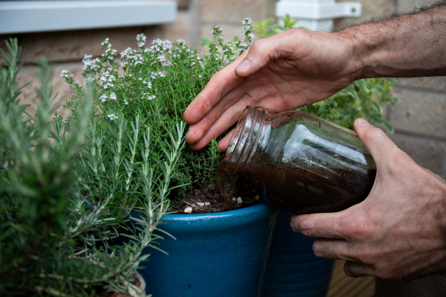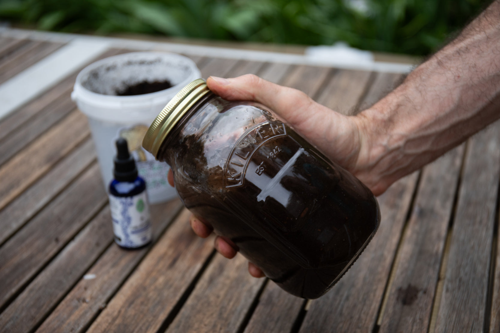 After making the extract, it is best to keep the liquid mixed while applying. Simply giving it a good stir before watering is fine. Nematodes are relatively heavy and will sink to the bottom, so keeping it agitated we ensure even application of all the compost extract constituents.